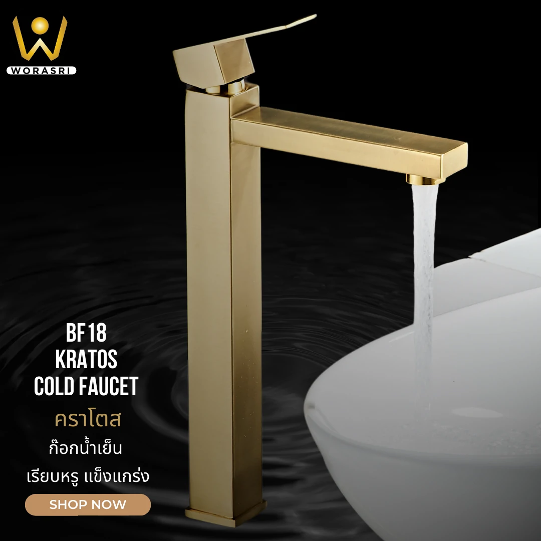 BF18 ก๊อกอ่างล้างหน้าทรงสูงดีไซน์เหลี่ยมสีทอง คราโตส สแตนเลส 304 สีทองแมท (Kratos Basin Faucet)