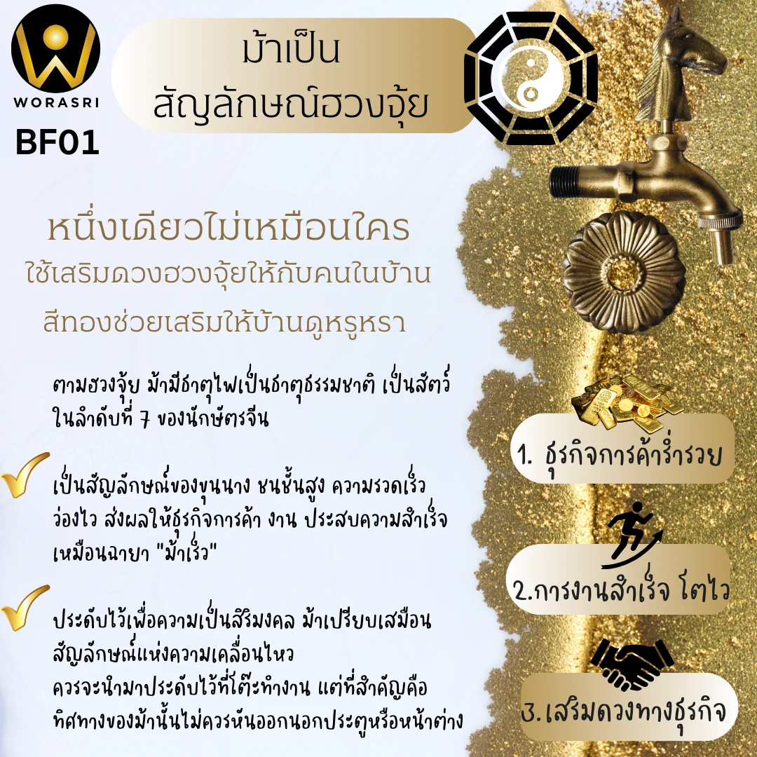 ก๊อกล้างพื้นนักษัตรม้าสีทอง ก๊อกน้ำรูปปั้นม้าถือเป็นสัตว์ที่เปี่ยมไปด้วยพลังและเป็นสัญลักษณ์ของขุนนาง ความรวดเร็วว่องไวส่งผลให้ธุรกิจการค้า การงานประสบความสำเร็จเร็วเหมือนฉายา “ม้าเร็ว” เพียงนำก๊อกน้ำทองเหลืองรูปปั้นม้าวางประดับไว้ที่บ้านหรือร้าน และยังใช้งานจะล้างมือหรือล้างหน้า รดน้ำได้จริง Brass Animal Head Faucet